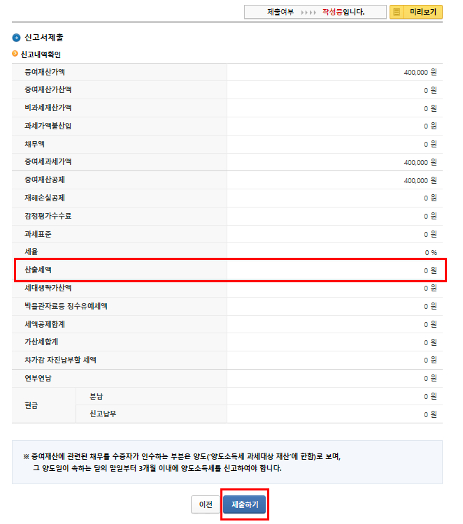 8. 다음 화면으로 증여재산공제가 되어 산출세액이 “0”원임을 다시 확인하고 제출하기 버튼을 선택하면 증여세 신고가 완료됩니다.